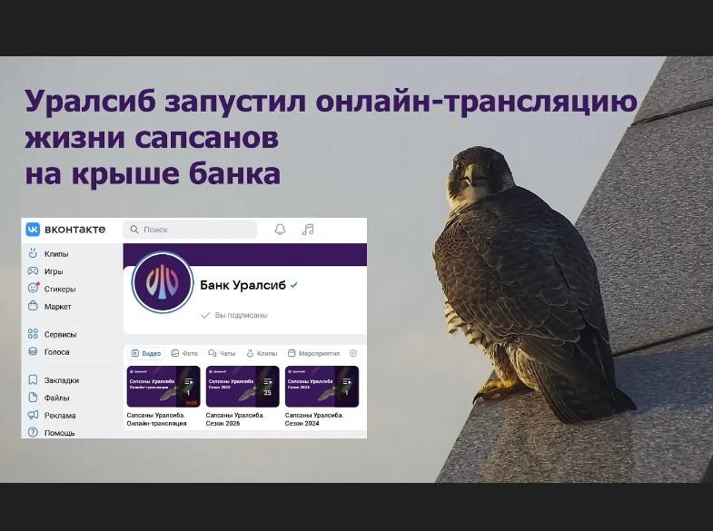 Семейство соколов-сапсанов каждую весну возвращается на крышу здания офиса банка в центре Уфы, выбрав для гнездования небольшой технический выступ. Сотрудники банка установили здесь камеру, организовали доступ орнитологов и ежегодно проводят уборку места гнездования, чтобы птицам и их потомству было сухо и комфортно в течение всего сезона. С 2019 года банк ведет круглосуточную онлайн-трансляцию о жизни сапсанов в период появления и взросления их птенцов. Зрители в «прямом эфире» наблюдают процесс насиживания кладки, появление птенцов и их первые попытки «встать на крыло». Предыдущие трансляции набирали огромное количество просмотров и получили отклики ученых-орнитологов из разных стран мира.